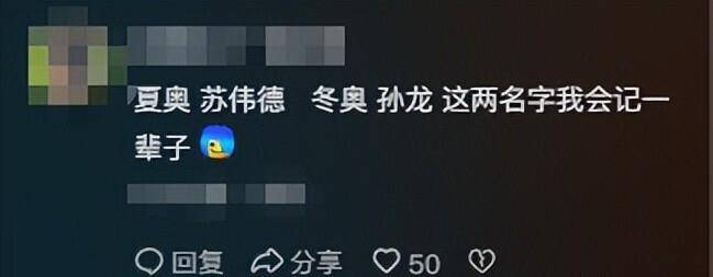 抖音创作者“冰上人生”在2月11日发布了一条混剪视频,将孙龙的失误镜头与王濛、武大靖等运动员早年比赛的失误片段并列展示。 视频字幕显示:“2002年盐湖城冬奥会,李佳军摔倒失金;2010年温哥华,周洋抢跑犯规;2018年平昌,韩天宇碰撞出局。 ”这条视频配文“失误是攀登巅峰的阶梯”,获得80万次点赞。 与此同时,知乎问题“如何评价短道速滑接力赛失误”下面,排名第一的回答引用了一句谚语:“冰场上没有常胜将军,只有永不放弃的滑行者。 ”该回答收到2万次赞同。